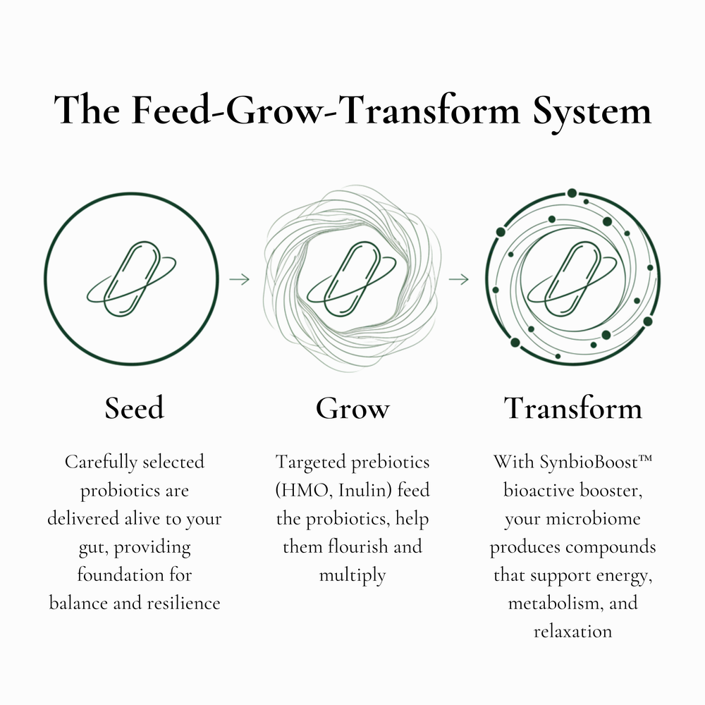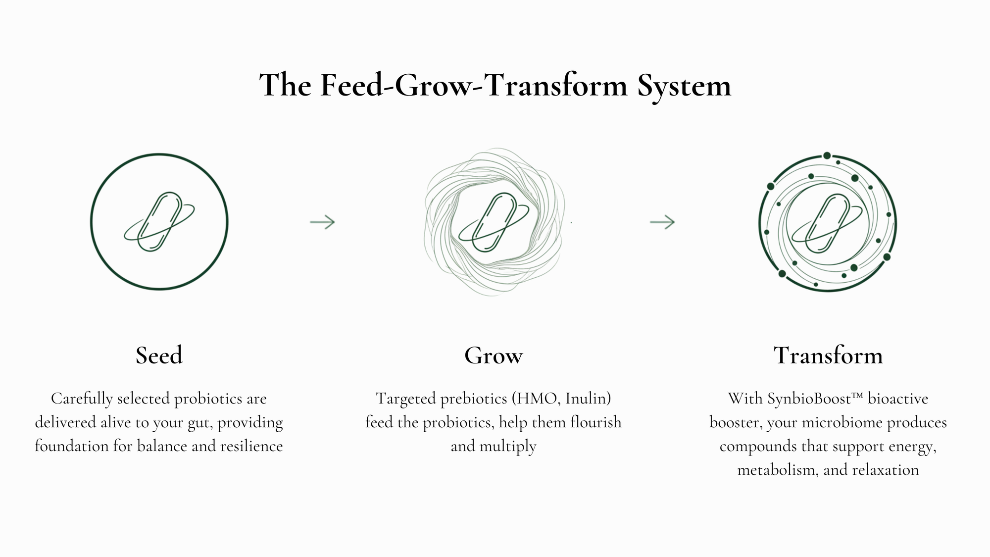 This is our core differentiator. Each Onelive+ product features a unique SynbioBoost™ blend, precisely formulated to work synergistically with your gut microbiome. These targeted precursor compounds are utilized by your flourishing beneficial bacteria to create powerful new postbiotics and bioactive compounds. This final, transformative step is what precisely unlocks benefits for energy, metabolic health, or calm, delivering a true upgrade to your internal system.