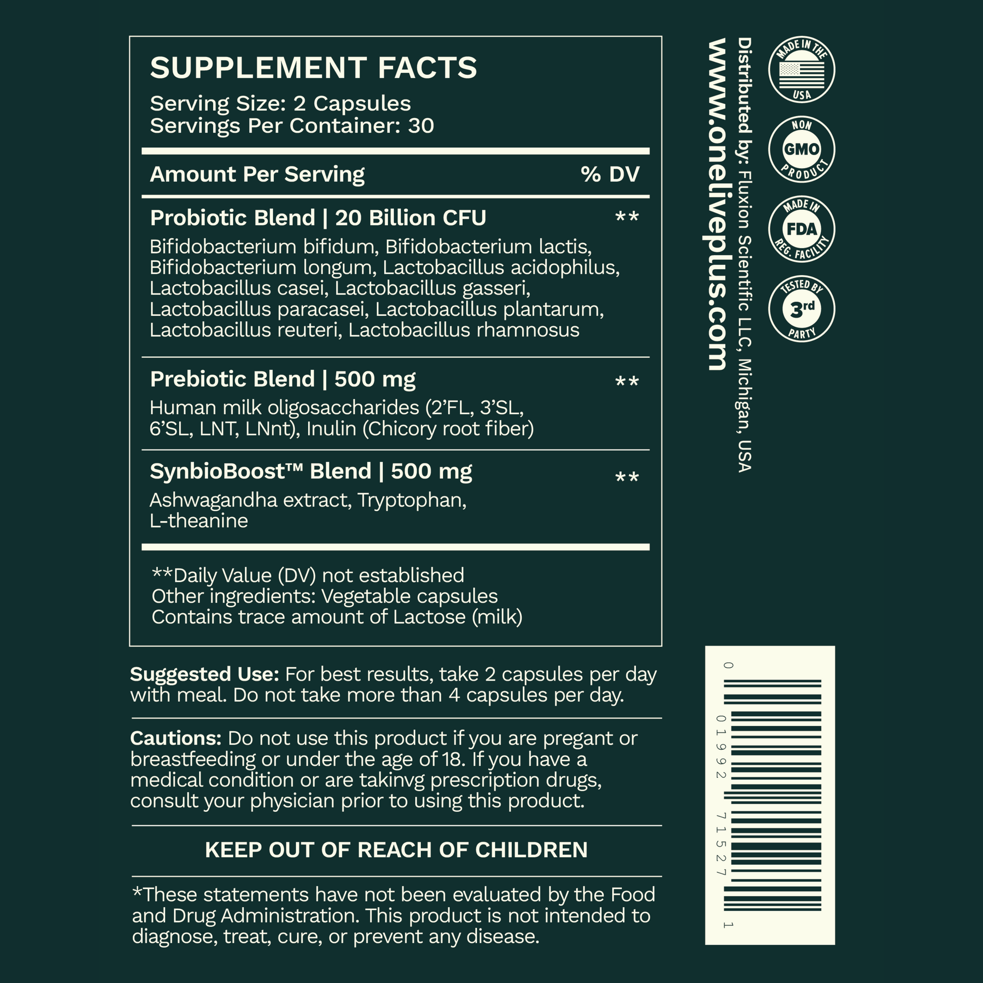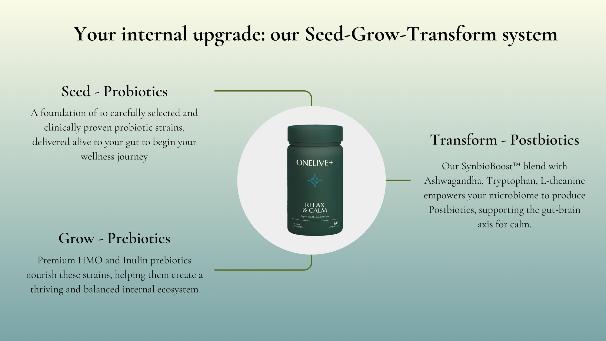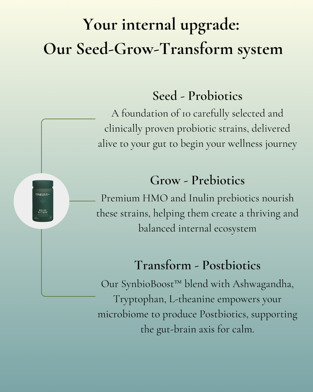 Relax & Calm targets the gut-brain axis to support a calm disposition and restful sleep. Our potent probiotic blend establishes a balanced gut microbiome, which is then nourished by our premium HMO prebiotics. The innovative SynbioBoost™ blend, featuring Ashwagandha, L-theanine, and Tryptophan, provides precursors that your thriving gut bacteria utilize to produce calming neurotransmitters, promoting internal serenity.