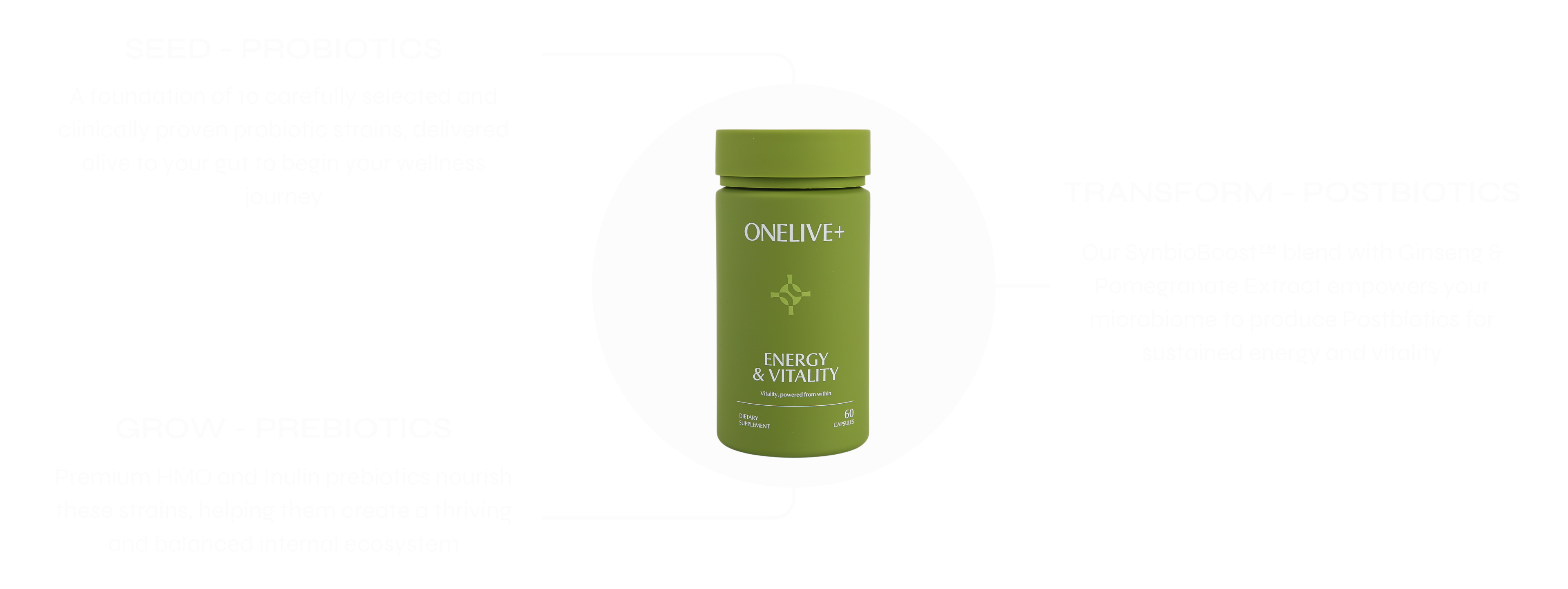 Ignite your body’s natural energy and find your strength from within. This advanced synbiotic formula is designed to combat fatigue and sluggishness by revitalizing your gut microbiome. It features a potent 20 Billion CFU probiotic blend, nourished by a premium prebiotic blend of HMOs and Inulin. Our unique SynbioBoost™ blend, with powerful Ginseng and Pomegranate extracts, works with your gut to support cellular energy production, helping you feel vibrant and fully charged every day.