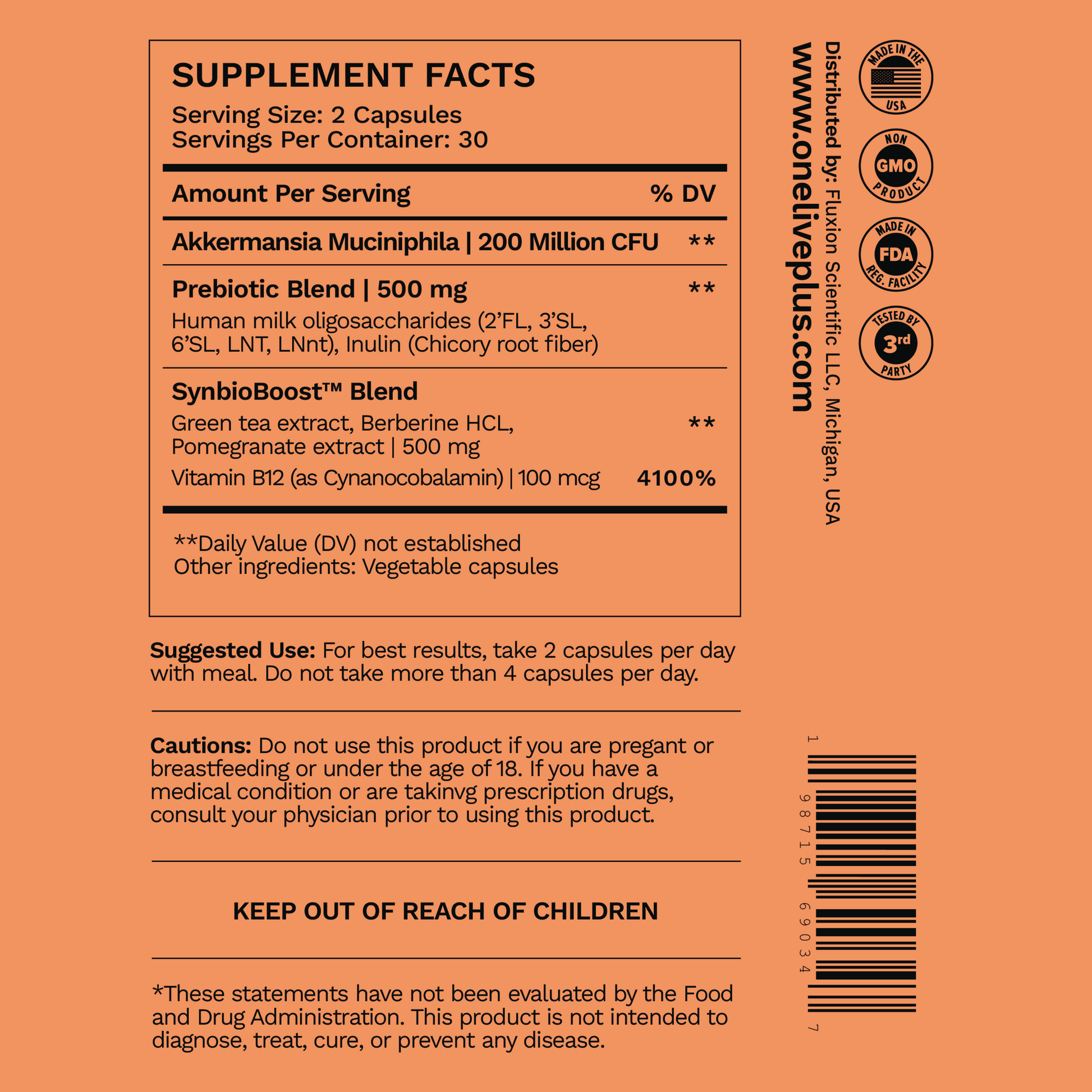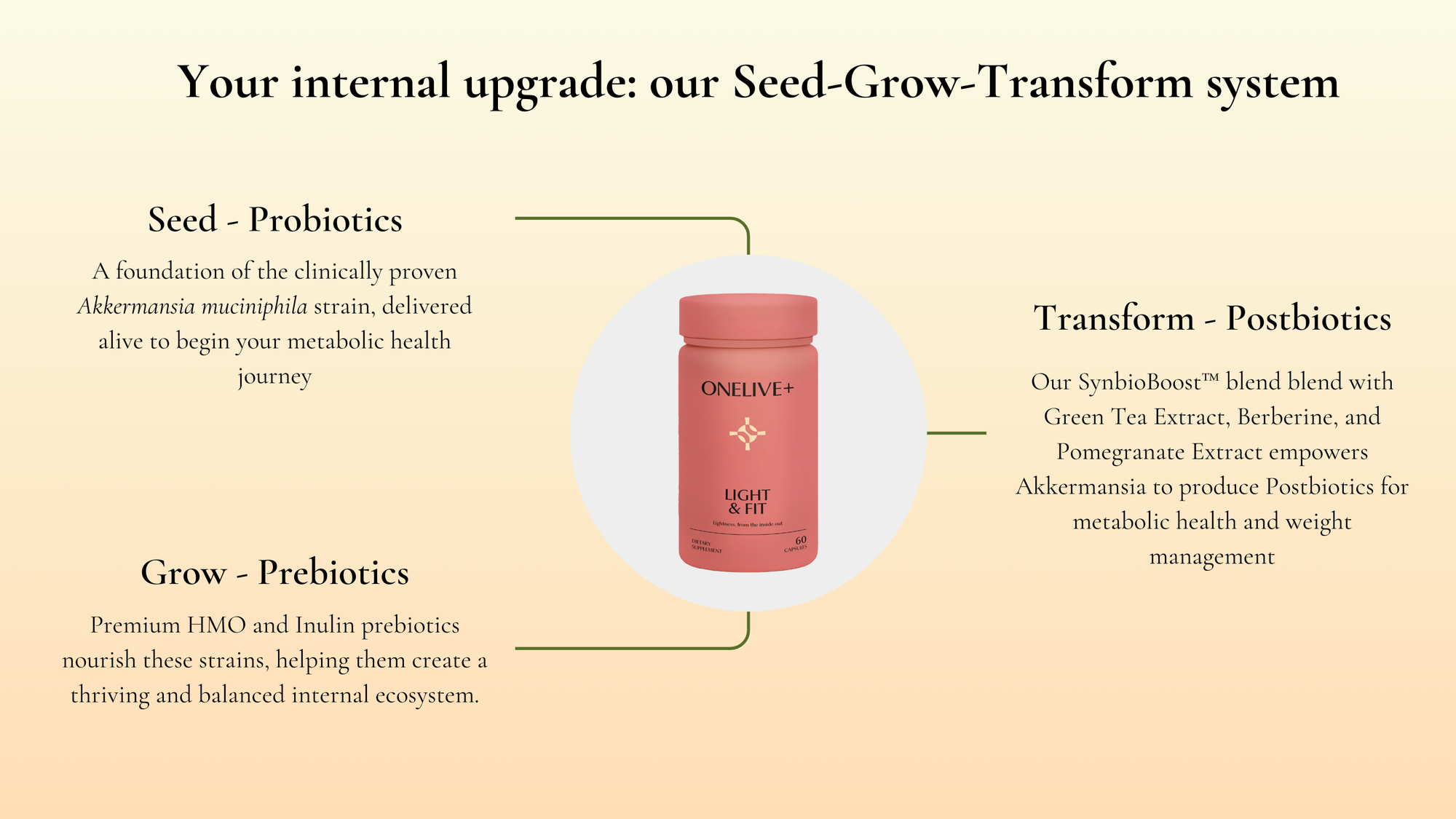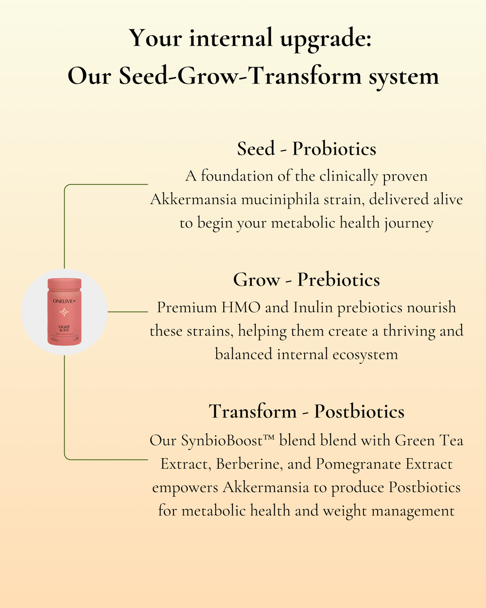 Light & Fit is a cutting-edge synbiotic specifically formulated for metabolic health. It features the pioneering probiotic *Akkermansia muciniphila*, a keystone strain that plays a vital role in gut barrier function and metabolic regulation. Our premium HMO prebiotic blend optimally nourishes *Akkermansia* and other beneficial bacteria. The SynbioBoost™ blend of Green Tea extract, Berberine HCL, Pomegranate extract, and Vitamin B12 works synergistically to further support your body’s natural metabolic processes and weight management journey.